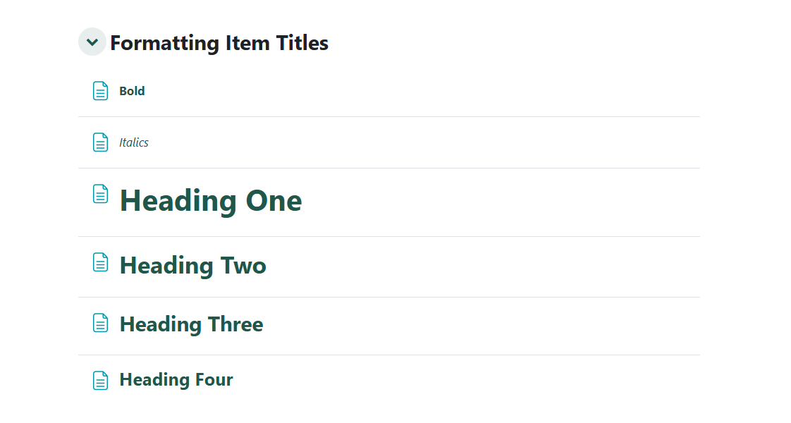 To add formatting to item titles, add html tags and end tags around the words to be formatted. For example: